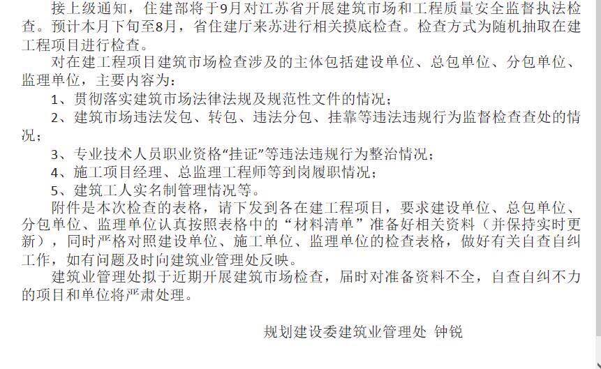 现将《住房和城乡建设部办公厅关于组织开展全国建筑市场和工程质量安全监督执法检查的通知》转发给你们,请各项目监理部根据文件要求,结合检查表,做好自查自纠工作,各事业部(直属部)做好复查工作,公司也将开展相应的抽查工作。